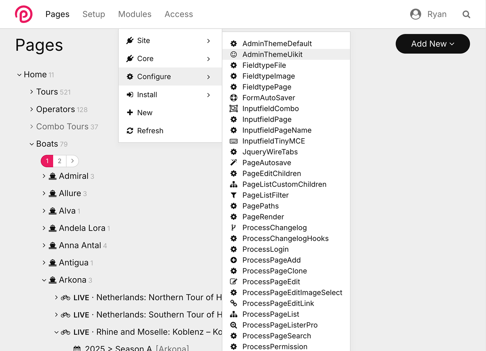 ProcessWire étant un système entièrement modulaire, chaque installation est quasiment unique en fonction des modules installés. L'installation de base comprend environ 140 modules, et il est possible d'en ajouter autant que nécessaire depuis le répertoire des modules , ou de créer facilement les vôtres .
